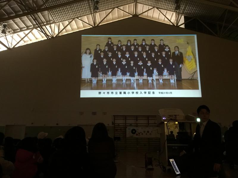 今の6年生が入学してから、これまでの思い出を体育館の壁に映し出しました。