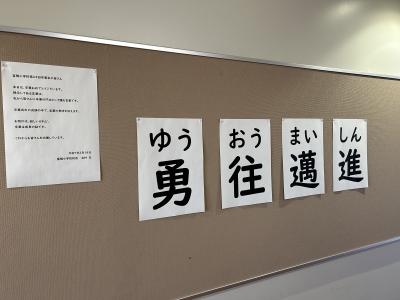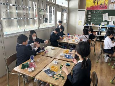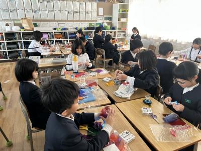と言う願いから、図工の時間に在校生へのメッセージの作品を作りました。