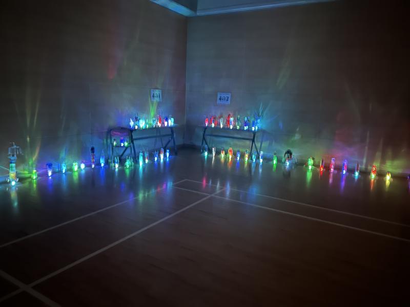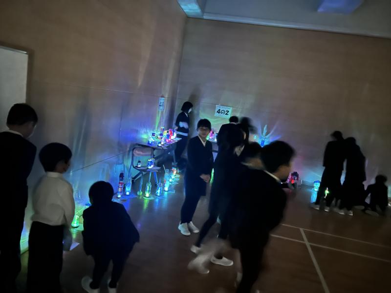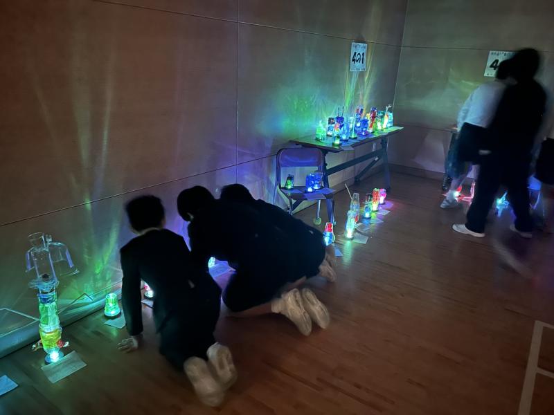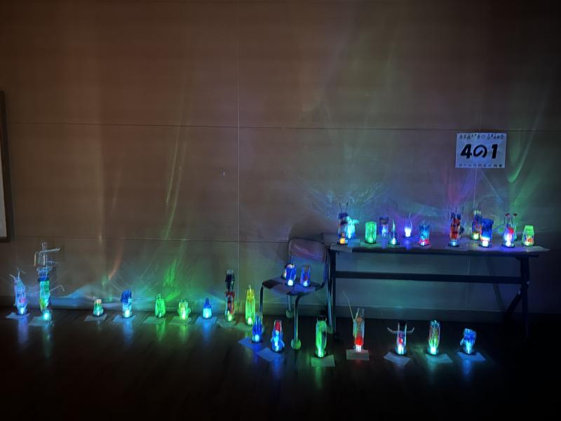 小体育館での展示会の様子です。暗幕カーテンをひいてランプをつけたら、想像以上にきれい!!