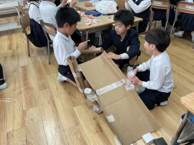 段ボールなどの廃品をもってきて、工夫を凝らして作りました。
