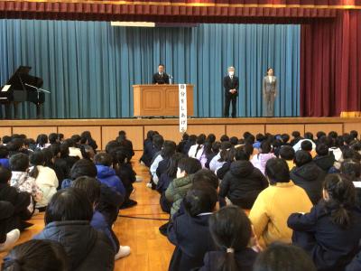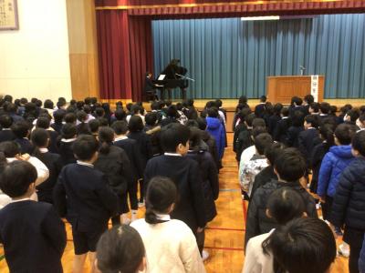 全校朝会は、校長先生のお話と校歌斉唱。