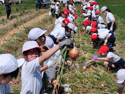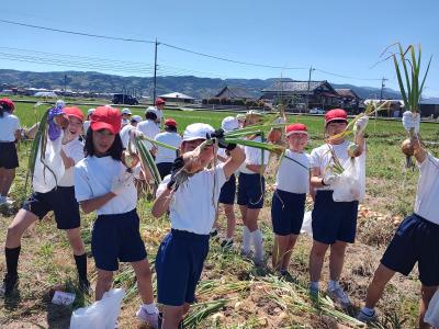 富陽小では、JAさんのご厚意で、毎年3年生の頃に玉ねぎを子供たちの手で植えて、
