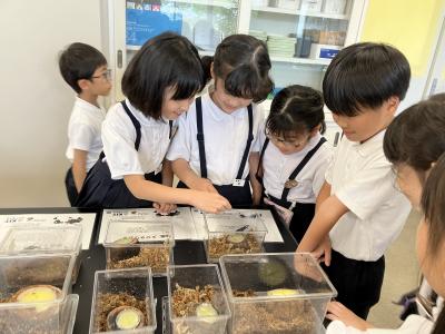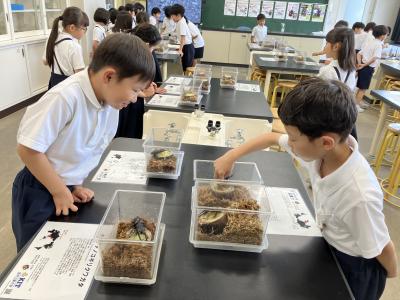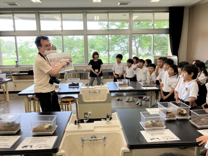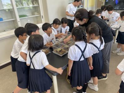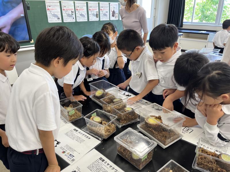 金沢工業大学むしの会の平野徳之先生のご厚意で、1年生から3年生の子供たちに、昆虫の実物を見せていただきました。