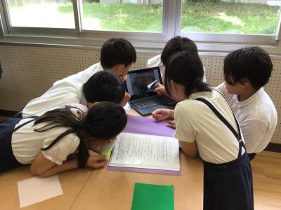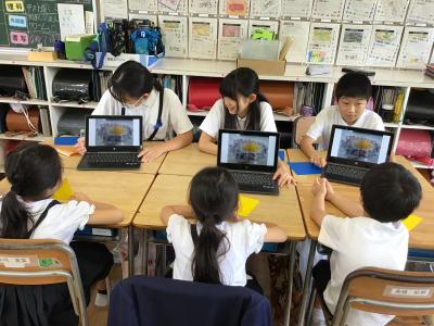 まず、クロムブックを使って、上の学年の子供が、下の学年の子供に、平和に関する本の読み聞かせをしました。