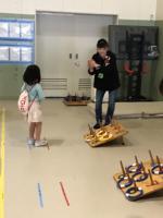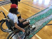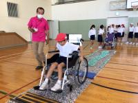 くるま椅子を運転。くねくね曲がったり、凸凹をとおりぬけたり・・・。