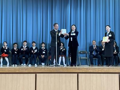 富陽小学校では、「全校朝会」は校長をはじめ先生からのお話と校歌の斉唱をし、引き続いて子どもが司会進行を行う「児童会集会」を行っています。