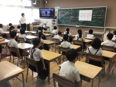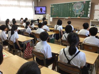 体育館は、熱中症が心配される暑さのため、エアコンの効く自分の教室で、校長先生の話などを聞きました。