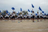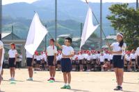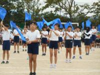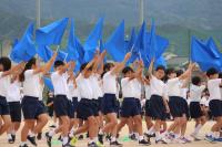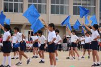 学年カラーの青のフラッグを振ってのフラッグダンスです。