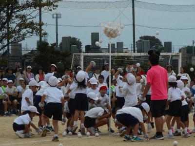 1年生はミッキーのダンスを踊り、笛の合図とともに玉入れをしました。