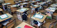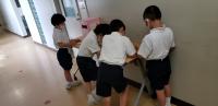 サイレンに合わせて机の中にもぐり地震に備えました。