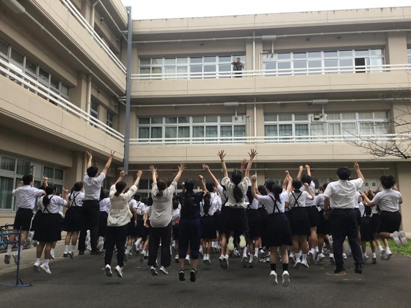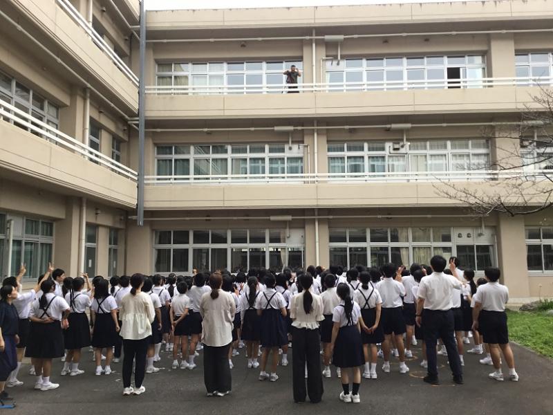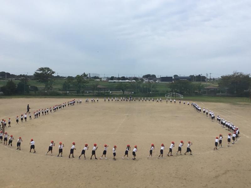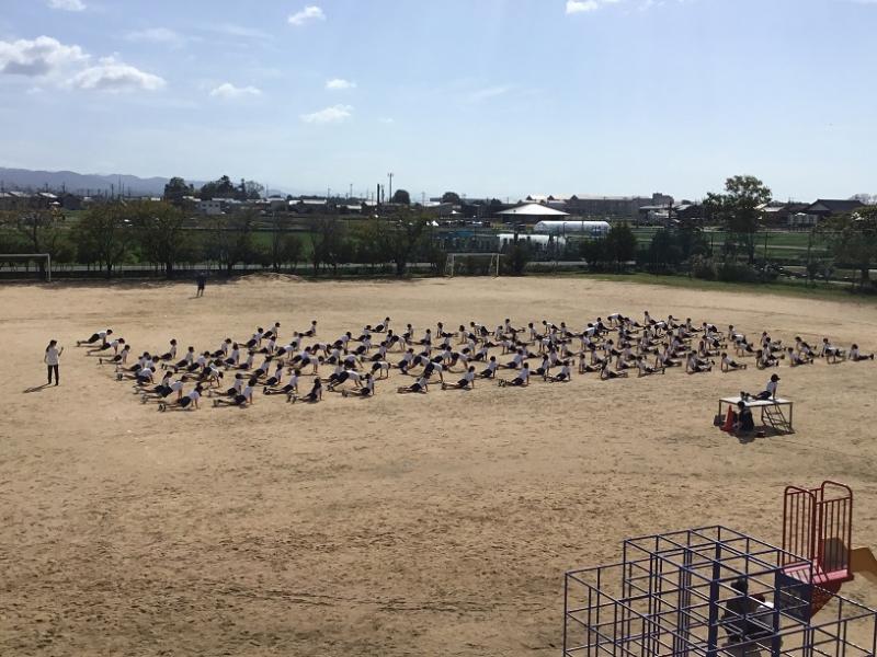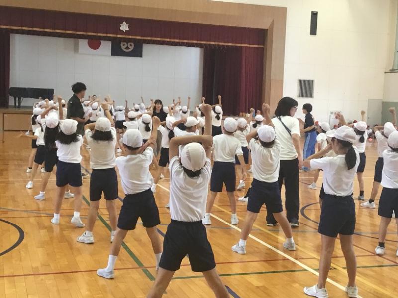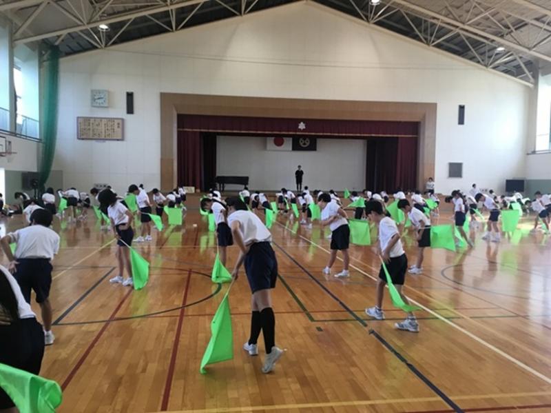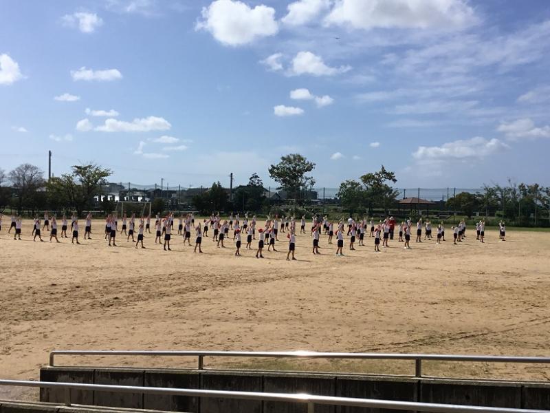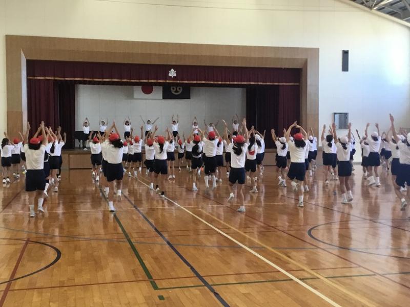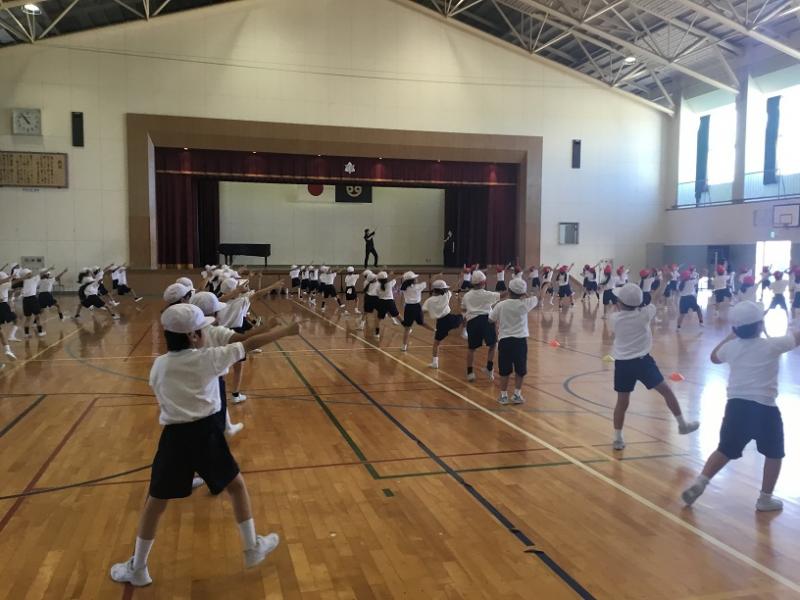 ▶1限 2年生 運動場に出て 曲に合わせて体を大きく使って踊れるように 練習をしていました。