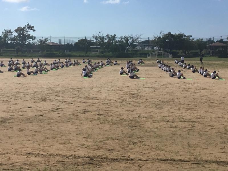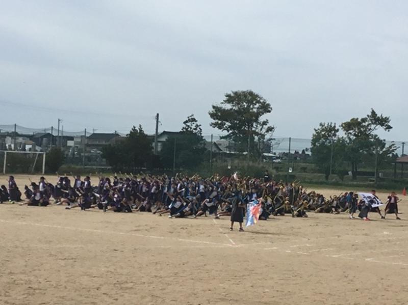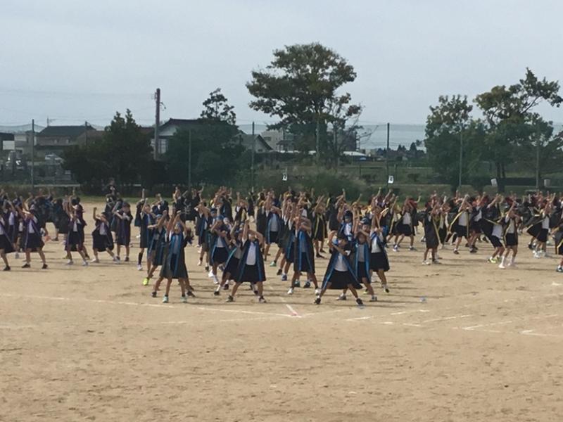 運動場での通し練習です。指令台の三浦先生を見なくても笑顔で踊る姿がたくさん見られました。