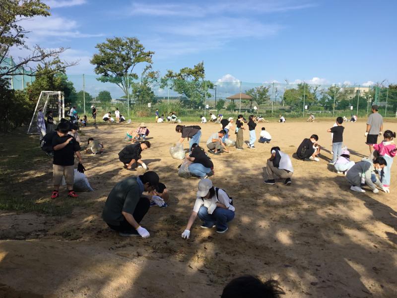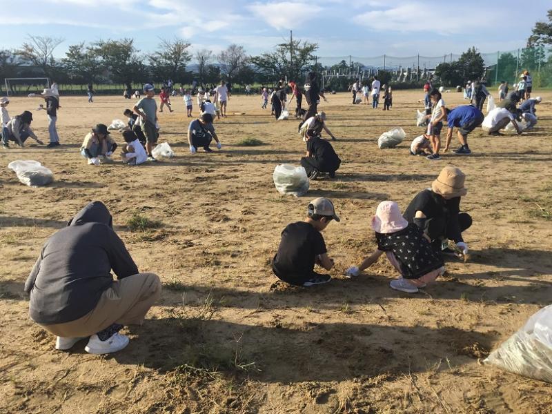 青空のもと たくさんの保護者やふよっ子の皆さんの参加により 運動場の草刈りや校舎の窓拭きを行いました。
