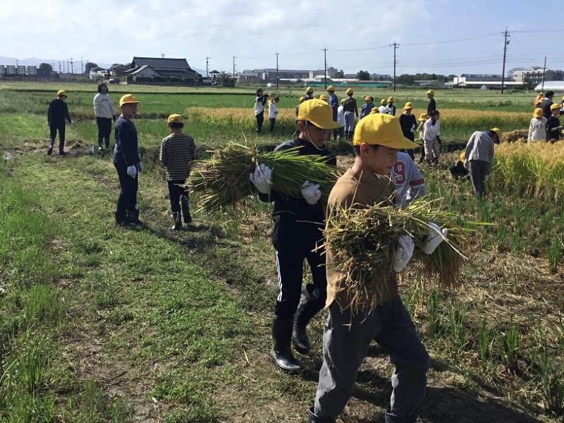 5年生は鎌で稲を刈り、束ねられた稲をトラックまで運びました。
