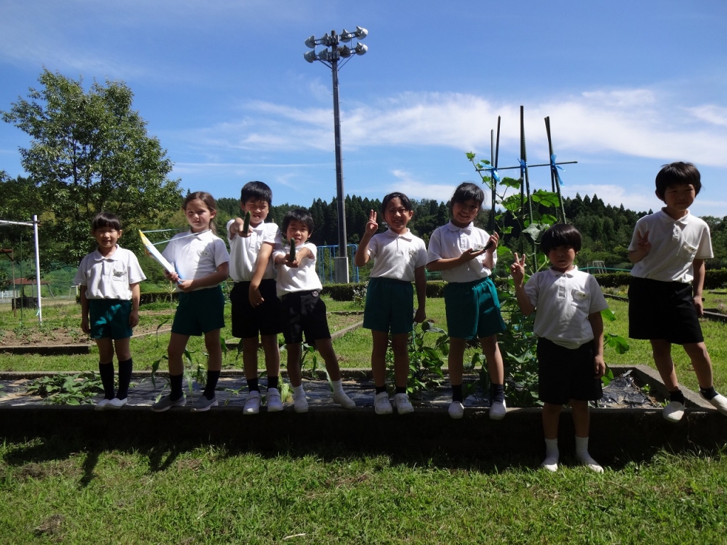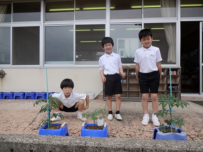 ミニトマト、ナス、きゅうり、トウモロコシ、さつまいもの苗を植えました。