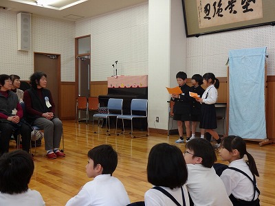 2年生は「こぐまの二月」の歌と合奏、「6年ビンゴ」の歌を発表しました。