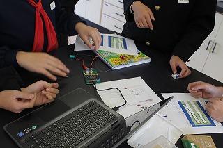 手回し発電機で自分たちが作った電気をコンデンサーにためて、人の動きや明るさをセンサーで感知して豆電球を光らせる、というプログラムをマイクロビットに送ります。