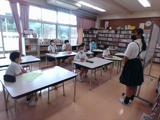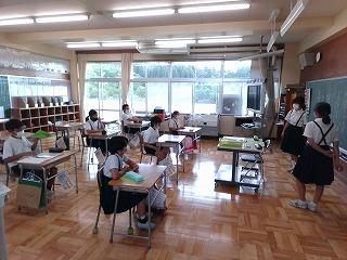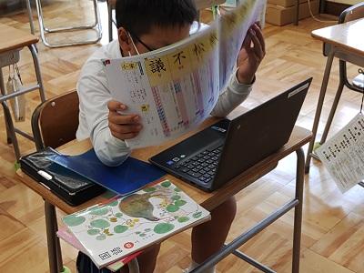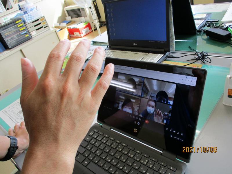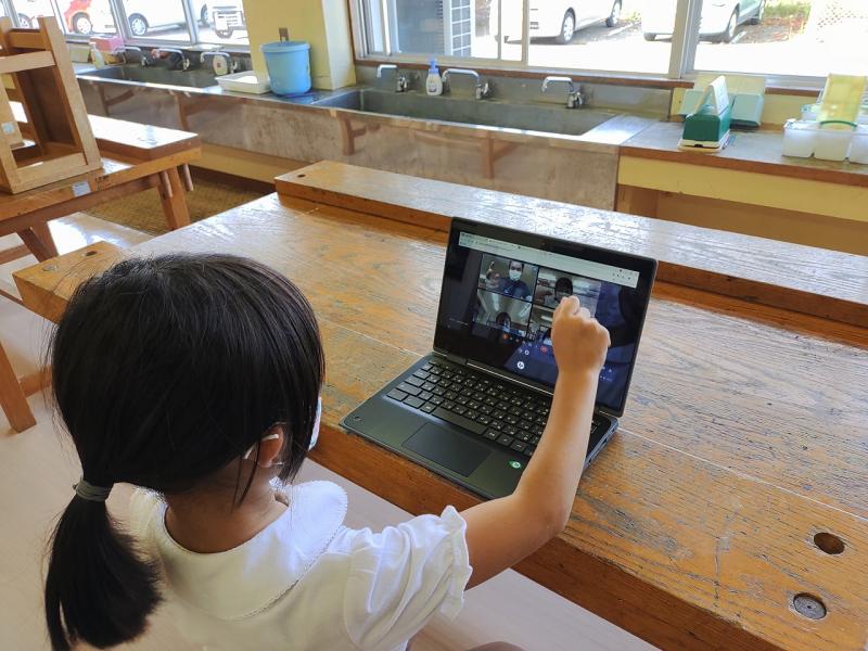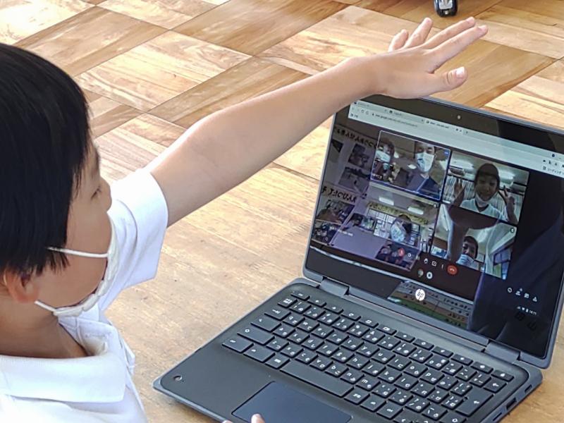 5時間目、1年生はタブレットを使い、オンラインで授業をしました。1年教室、図工室、パソコン室から職員室にいる先生と4人がバラバラの場所から会話をしたり、じゃんけんをしたり、楽しんで勉強していましたよ!