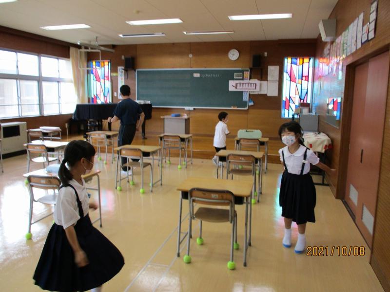 そして次にとなりのトトロの「さんぽ」を歌いながら、元気に手を振り、音楽室の中をぐるぐる歩き回りました♪
