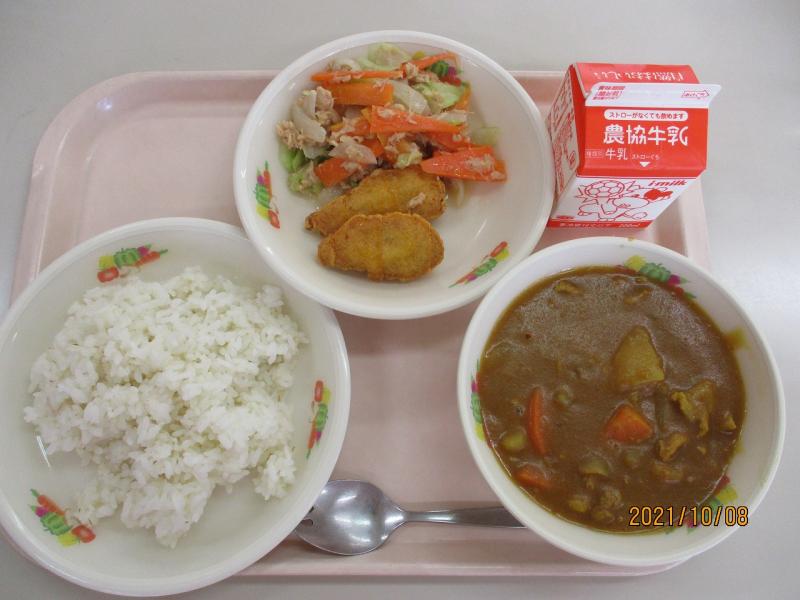 1ヵ月に1回のお楽しみ❤今日はカレーライスの日でした。みんなが大好きなチキンナゲットと、そして、10月10日は目の愛護デーなので、目に良いビタミンAが豊富なにんじんを使ったにんじんサラダの組み合わせでした。