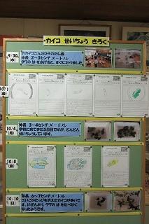 子供たちは、朝や帰りの時間に、進んでカイコのお世話をしています。また、どのくらい大きくなったのか詳しく観察して、カイコの成長記録を書いています。いつ繭ができるのか、これからの成長が楽しみですね。