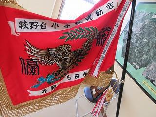 職員室前廊下に、赤組の優勝旗と白組の準優勝盾が展示されています。
