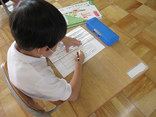 ①4限目の書写の時間に、1年生は郡市書写作品展に出品する作品を練習しました。また、「ましかく」、「たてなが」「よこなが」に書くひらがなを学習しました。