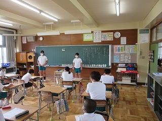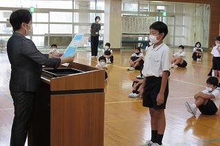 そして、5限には、全校集会を行いました。最初に、河北郡市科学研究物審査会の表彰を行いました。代表の6年児童が、立派な姿で賞状を受け取りました。優秀な成績を収めた児童のみなさん、おめでとうございます。
