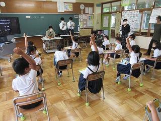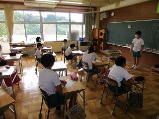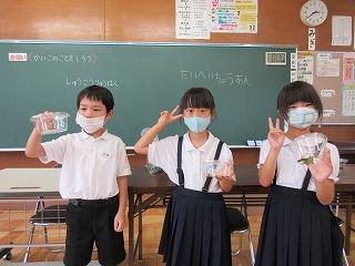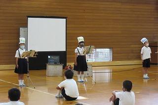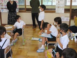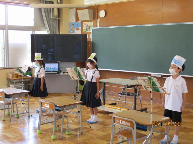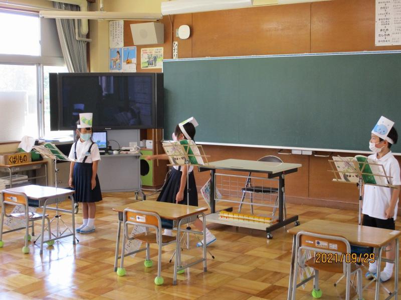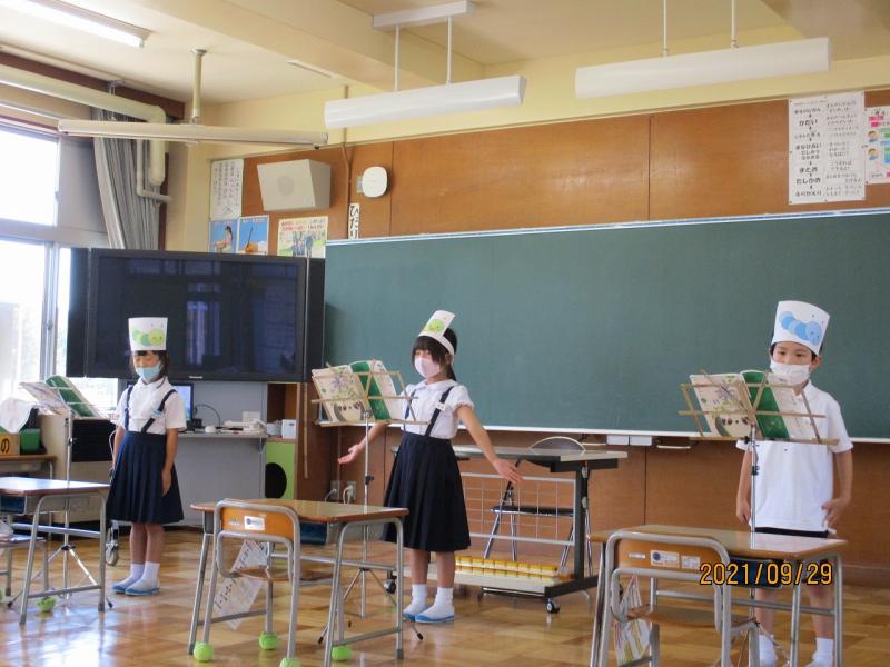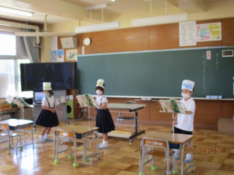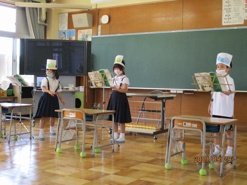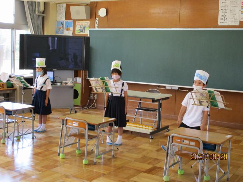 5時間目が始まり、1年生は音読発表会「やくそく」をしました。3人があおむしになって大きな木の葉っぱを食べるところから始まるお話です。3人で大きく声をそろえて読む場面では、ぴったりと息が合い、とても大きな声で聴かせてくれました。一人一人の場面でも、身振り手振りで、とても素敵に聞かせてくれました!!