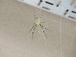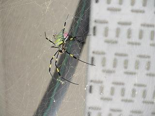 ⑤理科室横のかべに、とても大きなジョロウグモが2匹もいました。大きさ約15cmもありました。みんなびっくりしていました。片方の巣には、子どものクモも一緒にいました。