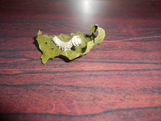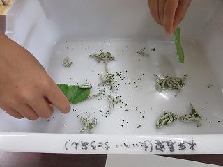 クワの葉をさかんに 食べています。 | 実際にクワの葉を あげてみました。 |