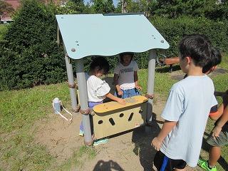 昼食が終わると、自由遊びの時間でした。子供たちは、遊具で遊んだり砂場で山をつくったりと、友達と楽しく活動していました。