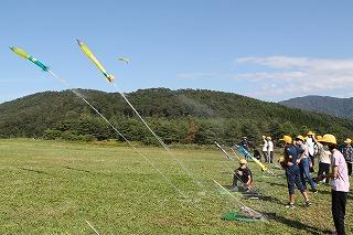 今日の活動はキゴ山登山と水ロケット飛ばしでした。登山では大人でも大変な遊歩道をがんばって歩くことができました。頂上ではよい景色を見ながら、3校のみんなで遊んだり、お弁当を食べたりしました。水ロケット飛ばしでは、グループのみんなと相談しながら、ロケットに入れる水の量や発射台の角度を調節し、ロケットを遠くまで飛ばすことができていました。