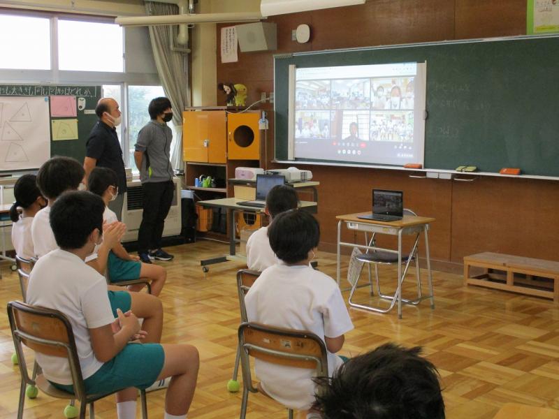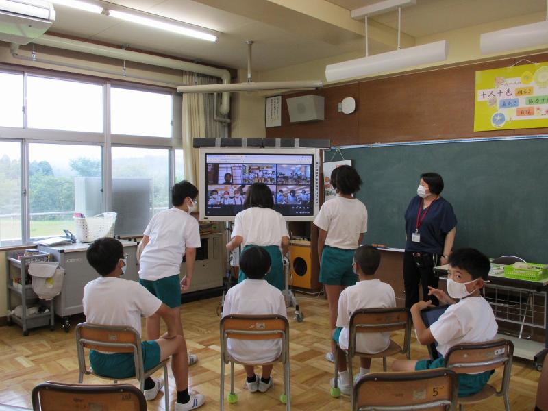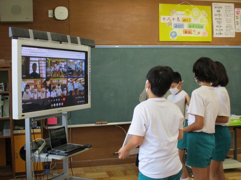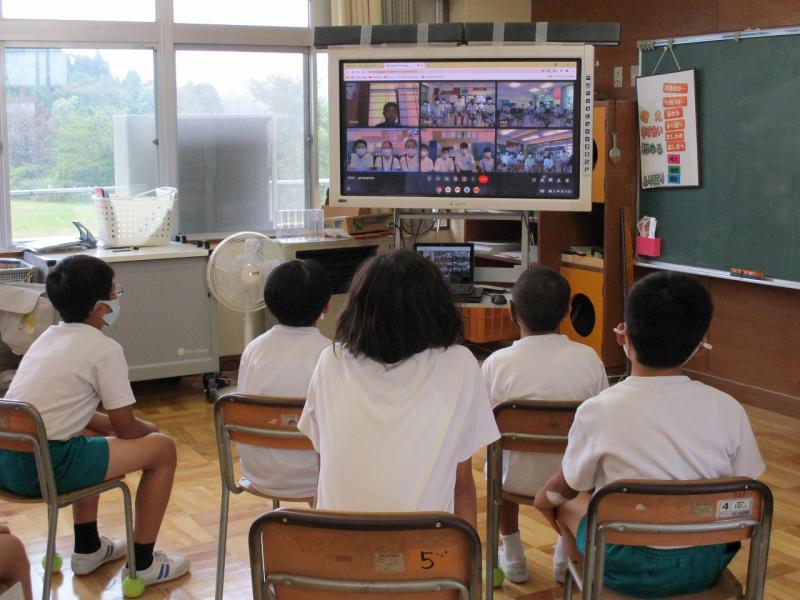 今日の午後、笠野小学校、刈安小学校、そして萩野台小学校の3校合同で、オンラインによる交流を行いました。10月4日、5日に合同で行う野外活動のめあてなどを発表するためです。