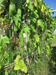 4月に植えたヘチマの小さな種は、みるみる大きくなり、花が咲き、実がなりました。その実が、緑色から黄土色に変わっているものも見受けられます。