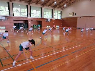 練習内容は、自分の座席位置、入退場の仕方、はぎのっ子ストレッチでした。5,6年生が1~4年生に並び方や行進の仕方などを教えていました。