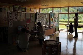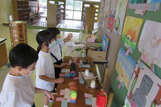 また、今日から校内作品展が始まり、子供たちが夏休み中に取り組んだ作品を展示しています。子供たちが、お互いの作品を見合い、感じたことをカードに書いて交流する姿が見られました。