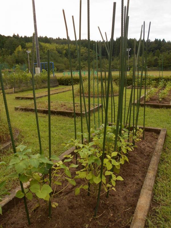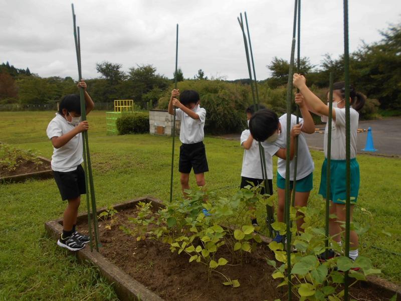 3年生は、6限目に、おまん黒小豆の苗に支柱をたてました。力強く棒を畑にさしました。花が咲いて、つるが伸びるのが楽しみです。