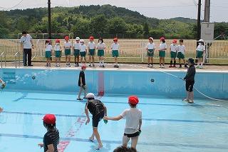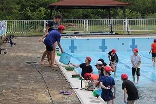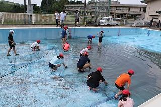 4~6年生が、ブラシを使って一生懸命プールの床や壁を磨いて汚れを落としていました。