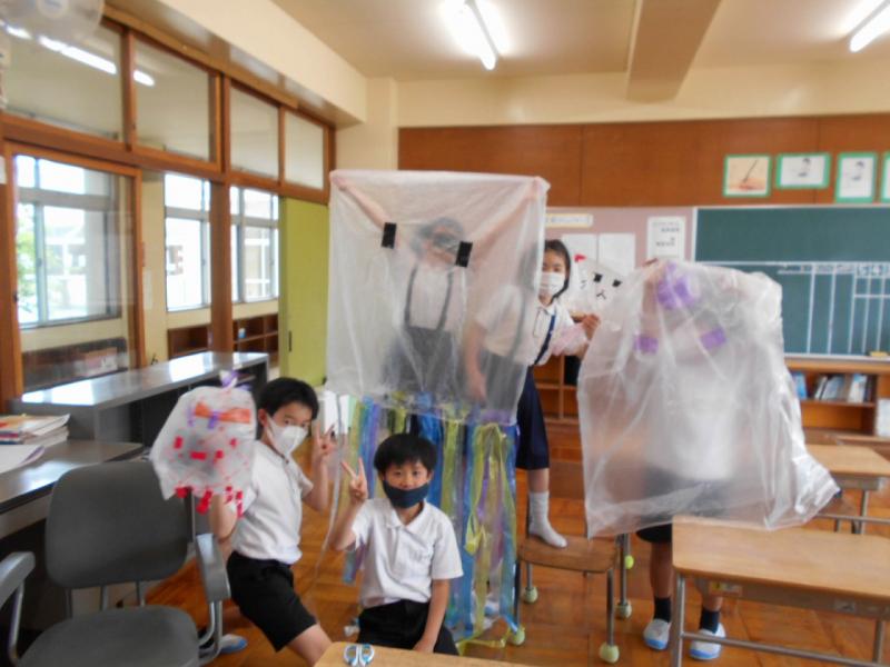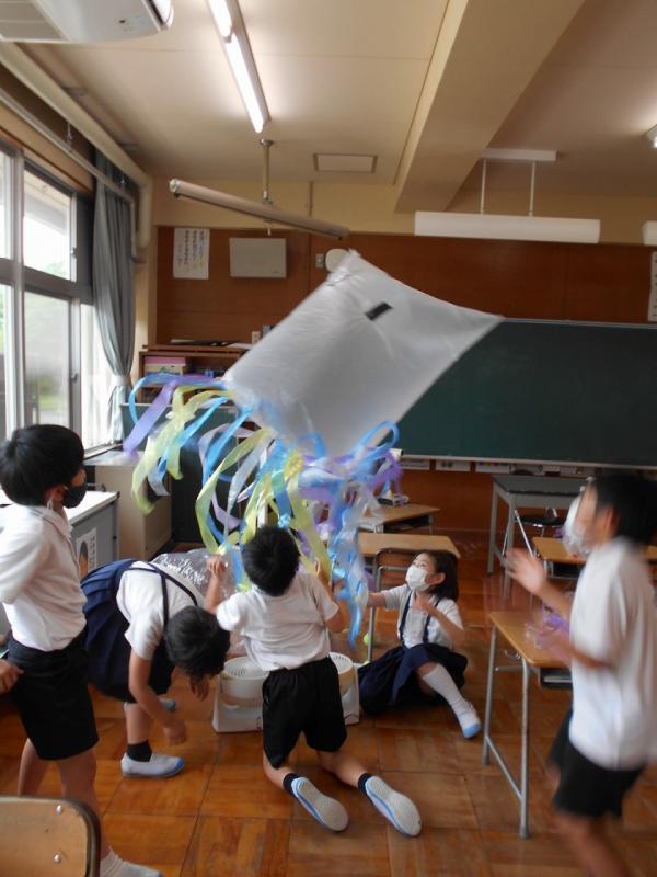 5人で作ったひらひらつきの大きなモンスターを浮き上がらせると、「モンスターのようだ!」と大笑いしていました。