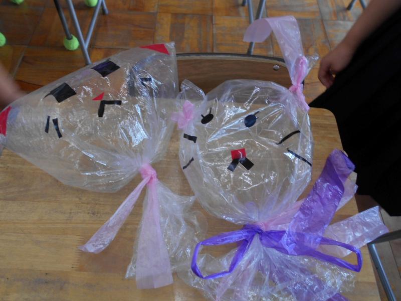 かざりをつけたポリ袋を送風機を使って、浮き上がらせました。
