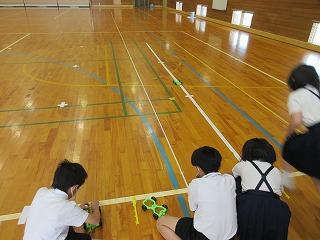3年生は、3限目の理科の時間に、「ゴムののばし方によって、物の動き方がどのようにかわるのか」の実験をしました。物の動き方は、車の進む長さで調べました。