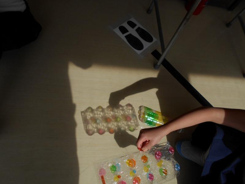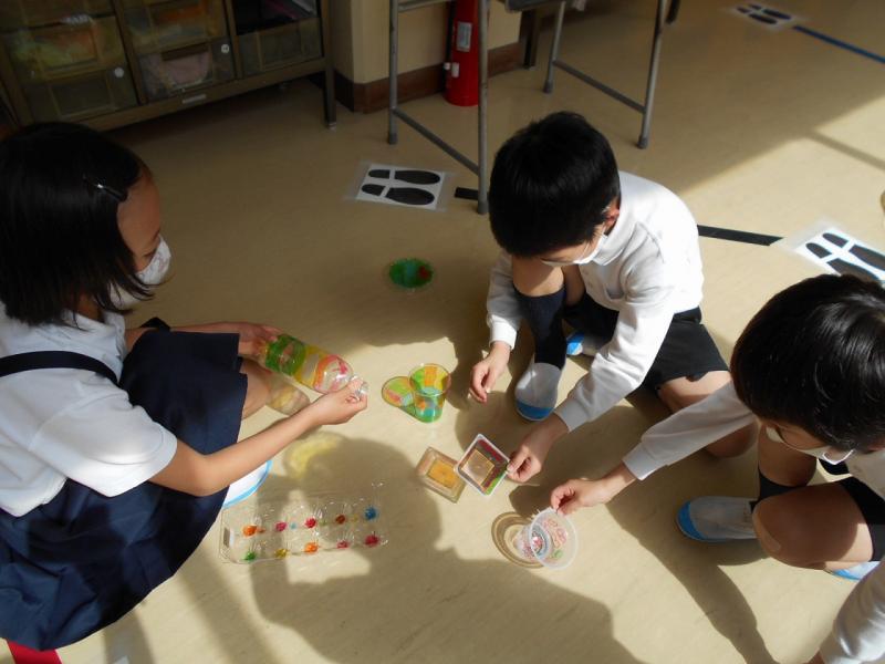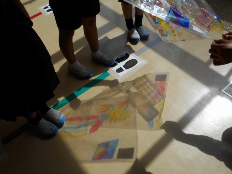 2年生は透明な入れ物に色塗りをして、「光のプレゼント」を楽しみました。おもしろい色や形が見られました。