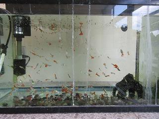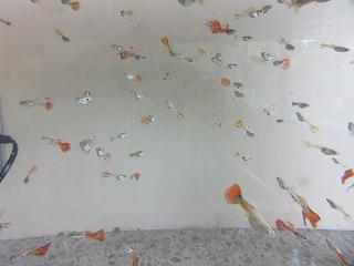 2階手洗い場横の水槽にグッピーがいます。大きめの水槽ですが、たくさん生まれ、グッピーにとって過密状態のような気がします。