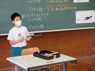 4年生は、5限目の理科の時間に、うでが動く仕組みについて学習しました。うでを曲げたとき、うでをのばしたときにうでの筋肉がどうなっているのかを考えながら学習しました。