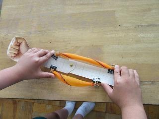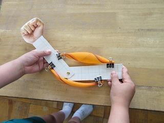 次に、先週一人一人が作った筋肉模型を使って、筋肉の様子や動きを確かめました。筋肉模型は、実際に見ることができない筋肉の動きを、模型の動きで確かめることができました。模型の筋肉が、もり上がってふくらんだ様子を見て、興味をもって、筋肉模型のうでを曲げたり、のばしたりしていました。うでをまげると、上の筋肉は縮み、下の筋肉はゆるんでいました。逆に、うでをのばすと、上の筋肉はゆるみ、下の筋肉はちぢんでいました。