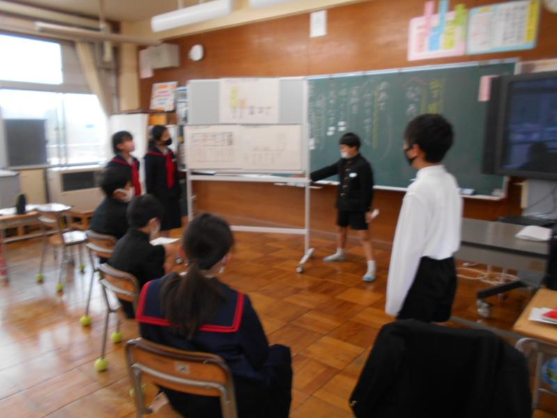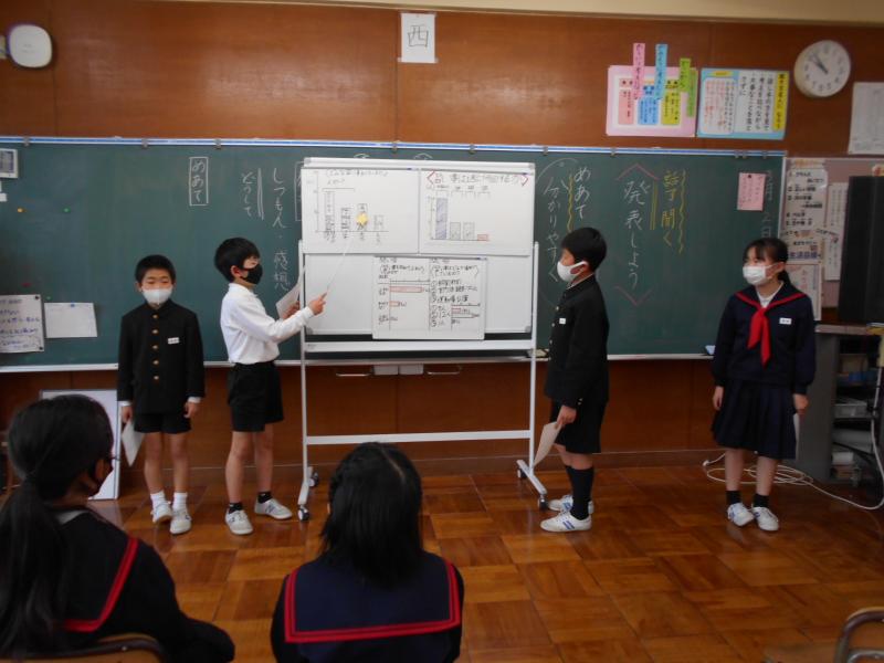 4年生は、国語「調べて話そう、調査隊」の学習で、グループごとにテーマを決めて、アンケートをとり、結果をまとめて、発表し合いました。発表のよかったところを伝えたり、疑問に思ったことを質問したりしました。大事なことが伝わるように話すことができました。