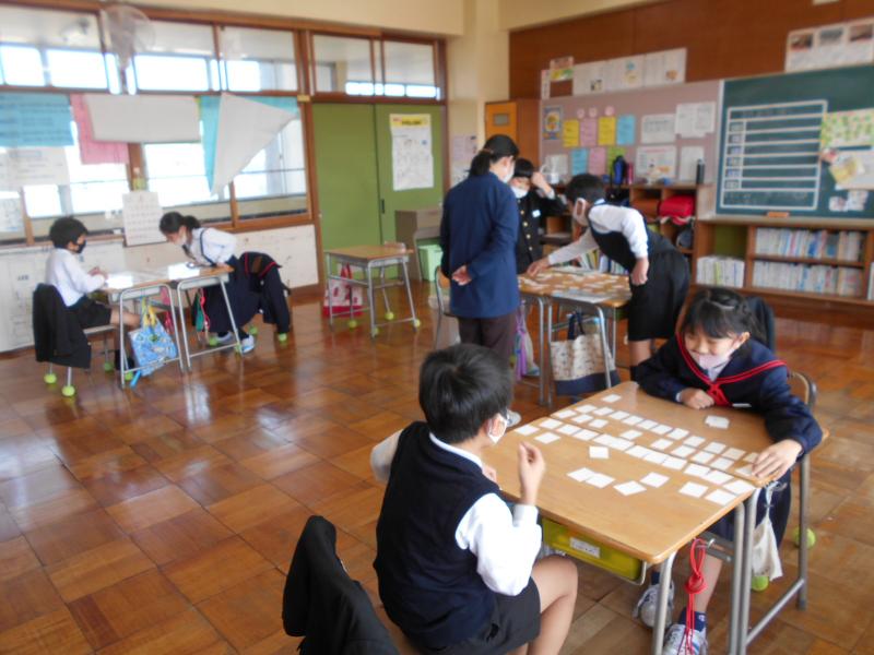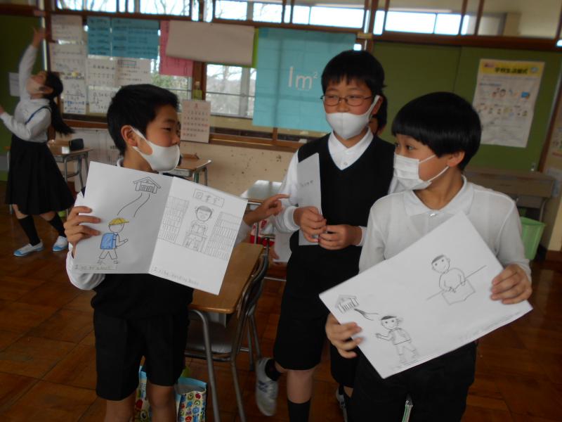 英語の時間には、「This is my day」(ぼくの1日)の学習で、1日の行動の表現を使って、「My book」を作りました。自分の1日の絵本作りに楽しんで取り組んでいました。時間が余ったので、ALTの先生に教えていただいた「アルファベット神経衰弱」(大文字・小文字合わせ)も楽しみました。みんな、とても盛り上がっていました。