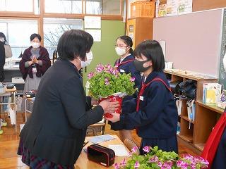小さな萩野台小学校から大きな中学校へ行くことを前向きに考えてほしい、そして夢を大切にしてほしいというお話のあと、6年生1人ずつに素敵な鉢植えのお花を頂きました。民生委員の皆様、ありがとうございました。