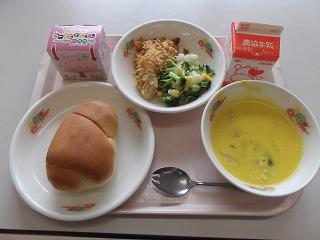 メニューは 牛乳、バターロール、かぼちゃのポタージュ、鶏肉のコーンフレーク焼き、花野菜サラダ、お祝いケーキです。